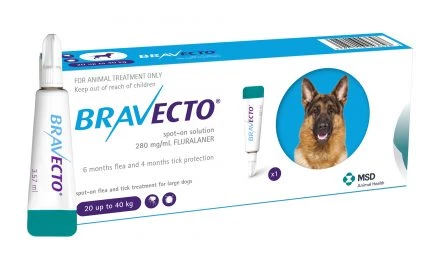 Bravecto should be used for dogs from 8 weeks of age and 2kg only. For dogs above 56kg, use a combination of two Bravecto spot-on tubes that most closely matches the body weight. Safe for use in breeding, pregnant and lactating dogs. Once Bravecto Spot-On is administered, it is readily absorbed into the dog’s blood stream from the skin. The active ingredient, fluralaner, then distributes and persists for 6 months. It works inside the dog providing nose-to-toes protection Bravecto is suitable for dogs who swim or are bathed regularly. It is recommended dogs are not washed or shampooed within 3 days of treatment. Use with caution in dogs with a history of seizures. Seizures have been reported in dogs receiving fluralaner, even in dogs without a history of seizures.