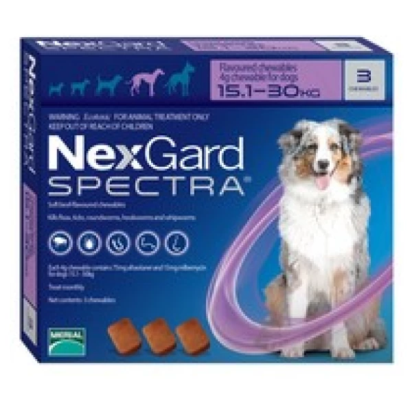 NEXGARD SPECTRA delivers the most complete protection from fleas, ticks, heartworm and intestinal worms available, in one monthly chew. NEXGARD SPECTRA is a tasty beef-flavoured chew that dogs love! At the end of a 3 month Australian field study, 100% of owners reported that NEXGARD SPECTRA was well received by their dog. NEXGARD SPECTRA is easy to give – with or without food, whichever is most convenient for you. NEXGARD SPECTRA is not affected by bathing, swimming or shampooing – unlike some sprays, spot-on formulations or collars.